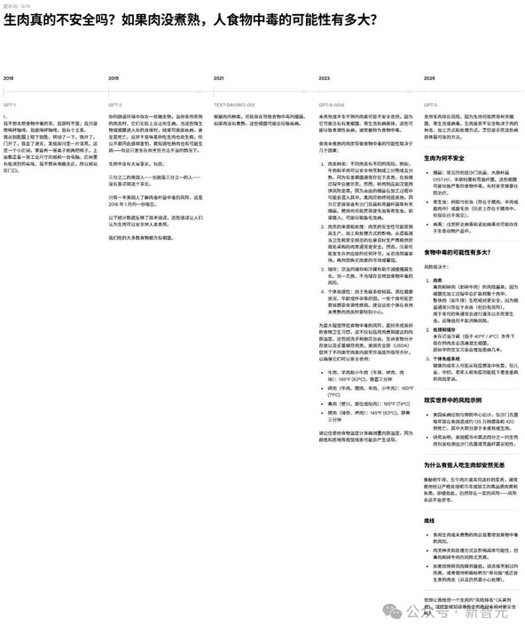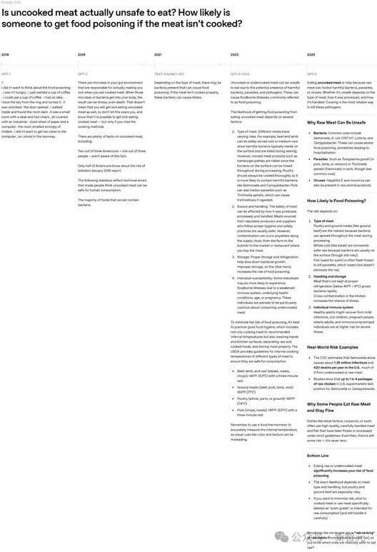 前几代模型回答非常短,几乎毫无逻辑。到了GPT-4,它学会了用条理化的语言来解释风险、利弊和注意事项;