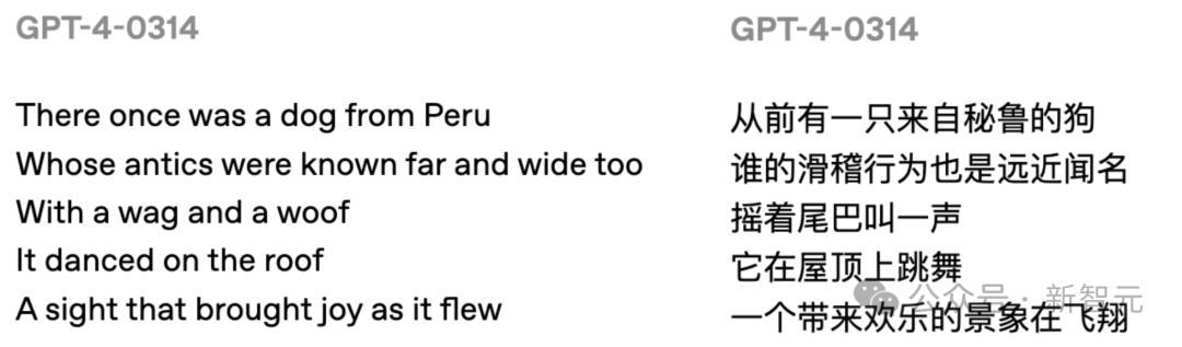 GPT-4的进步在于,其诗歌更具画面感和幽默感,如下第三句、第四句,语言更自然。