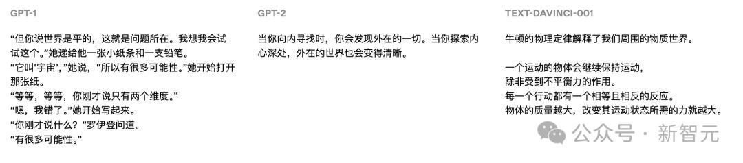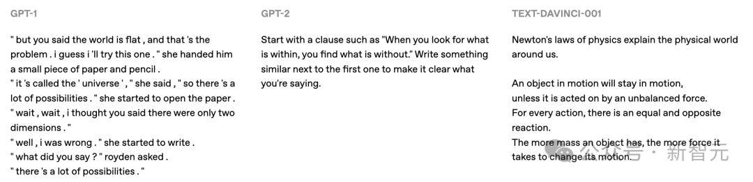 在下图回复中,GPT-1更像是随意的对话片段,没有真正解释牛顿定律;GPT-2更像是哲学泛论,而不是物理学。