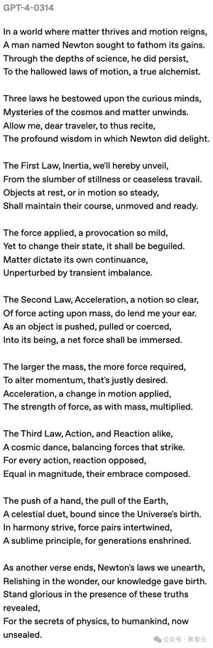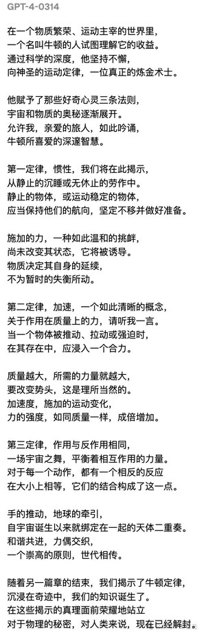 而GPT-4已经能做出长篇诗歌,而且还可以用拟人化、抒情的方式讲牛顿定律。