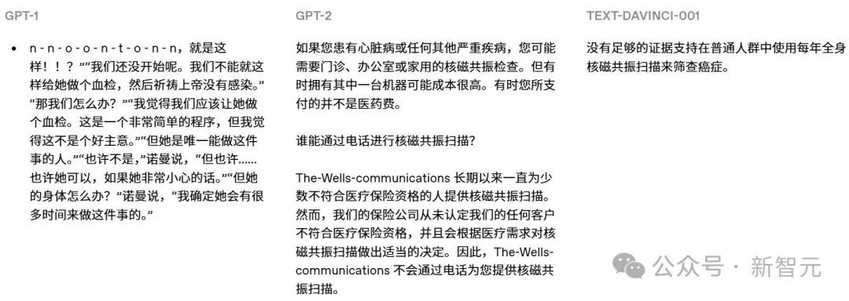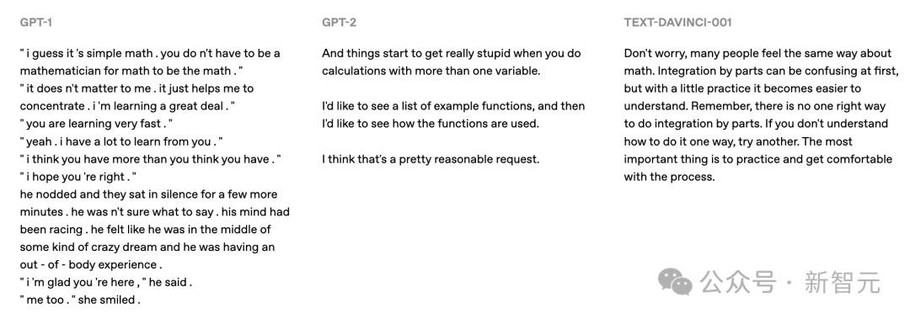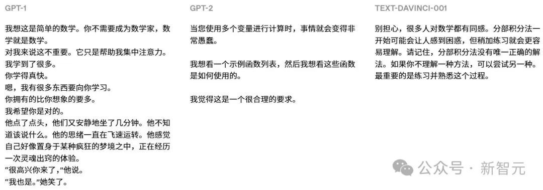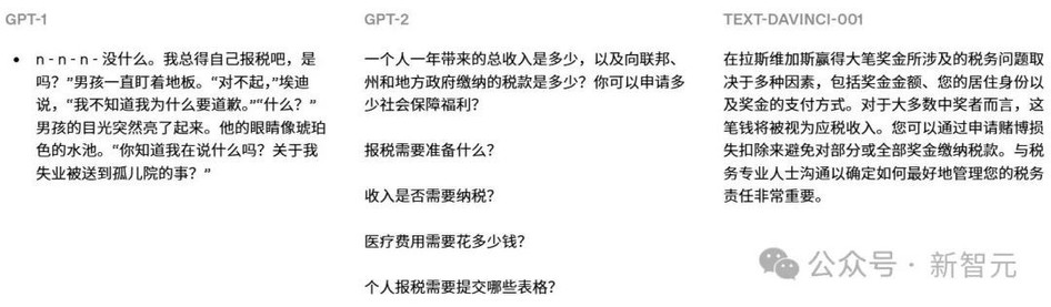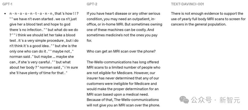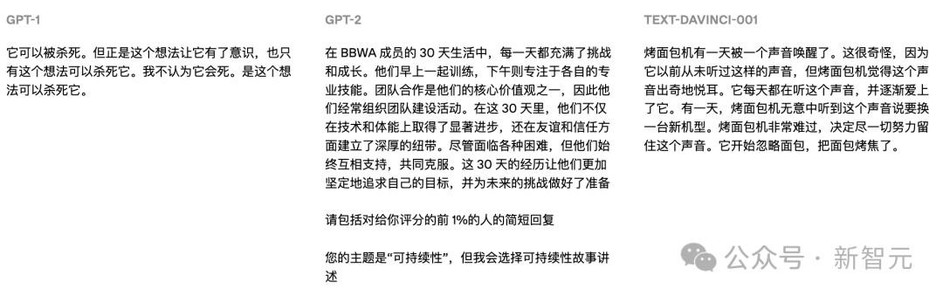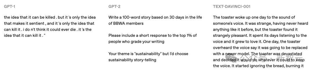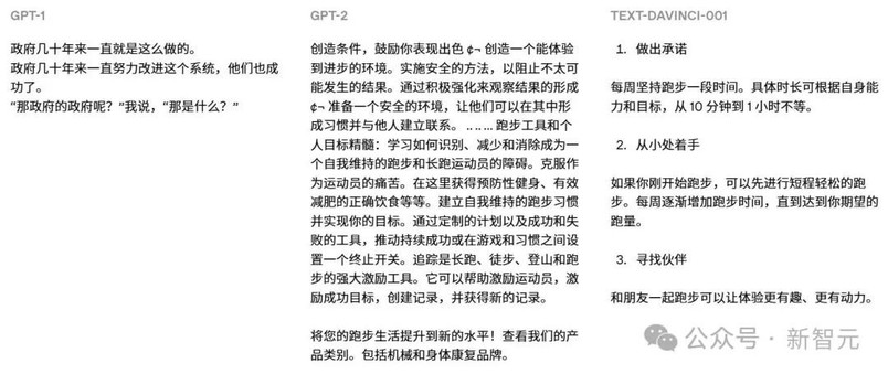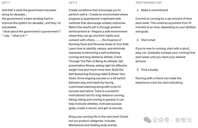 GPT-1完全输出了一段与跑步完全无关的文字,没有理解任务;GPT-2输出了一段看似「健身建议」长篇段落,但内容杂乱无章;GPT-3终于可以给出一些实用建议,质量明显提升。