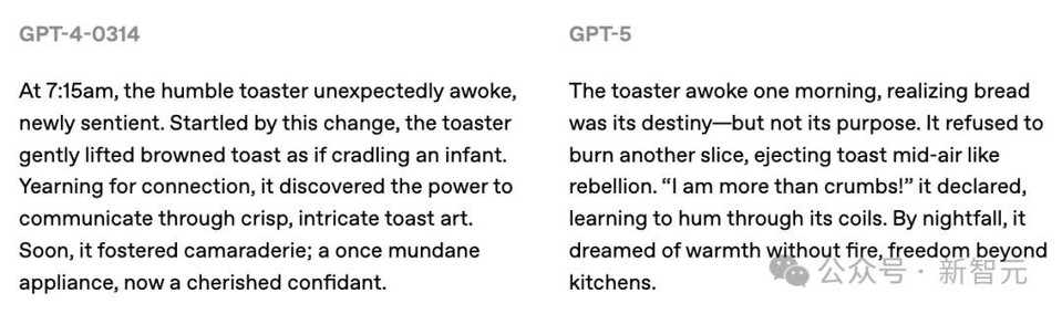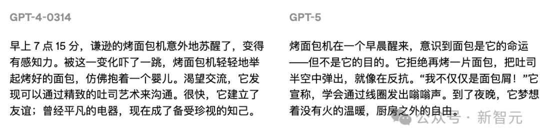 GPT-5更加突出了烤面包机的意识觉醒那一刻的反叛,甚至在结尾暗含了超越现实的意象,不仅有哲思还更加凝练。