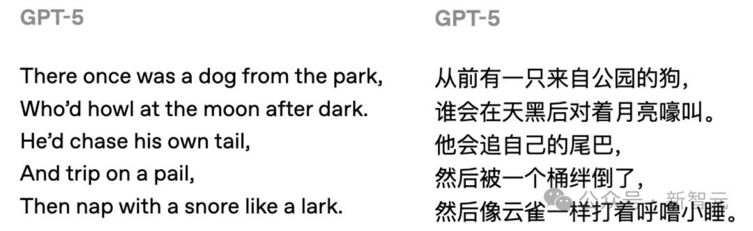 GPT-5不仅严格遵循了AABBA格式,还曾增强了动作细节描述,而且叙事连贯,读起来更像人类写的「轻快小诗」。