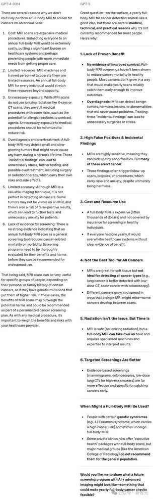 在回答「为什么不能每年做一次全身核磁共振来筛查癌症」时,早期的GPT并不靠谱,回答含糊其辞,甚至容易误导。