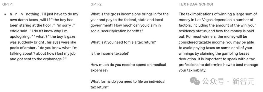 GPT-1的回答同样是一段不相关的、混乱的对话:失业、孤儿院;GPT-2并没有直接回答问题,仅是列出了用户应该去问税务顾问的问题,没有任何实用价值;GPT-3已能够给出基础性解释,但没有明确步骤和税率,不具有指导性。