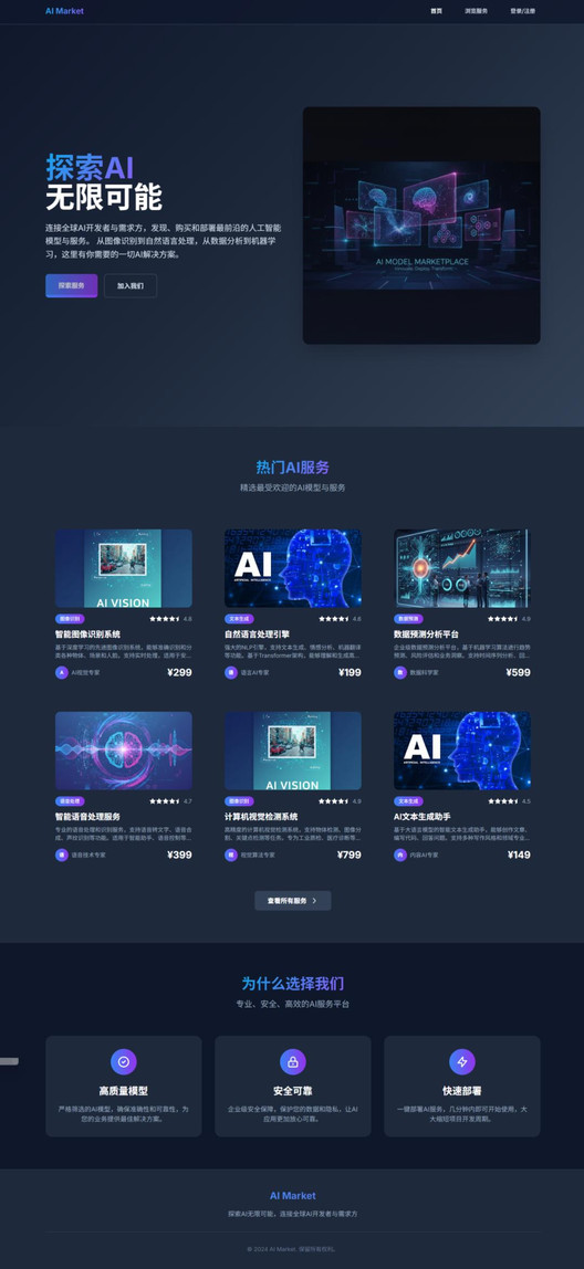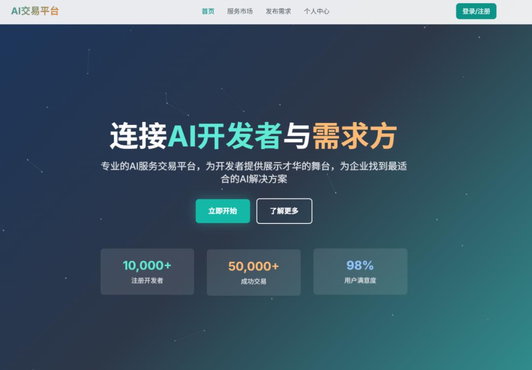 #项目模板搭建一个面向AI需求方(买家) 和AI开发者(卖家) 的在线交易平台,提供安全高效的撮合机制,支持 AI 相关服务、产品和Agent的发布、购买、洽谈与展示。