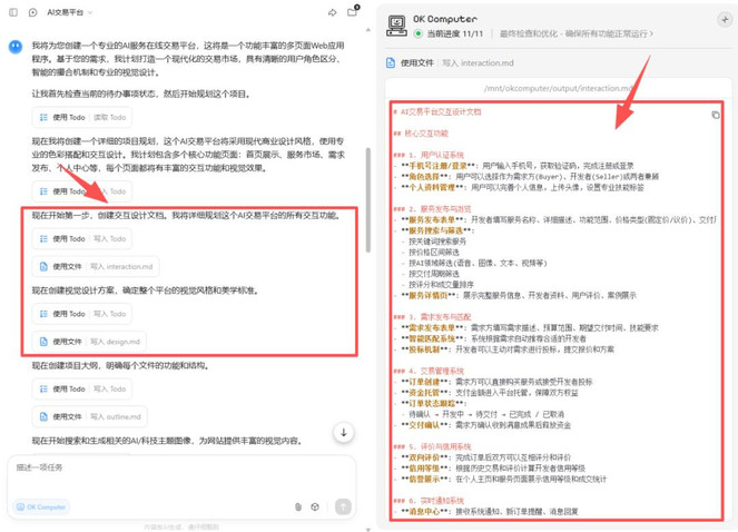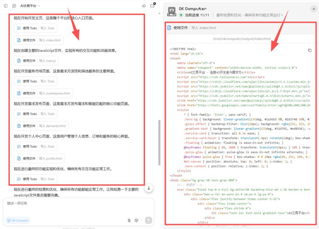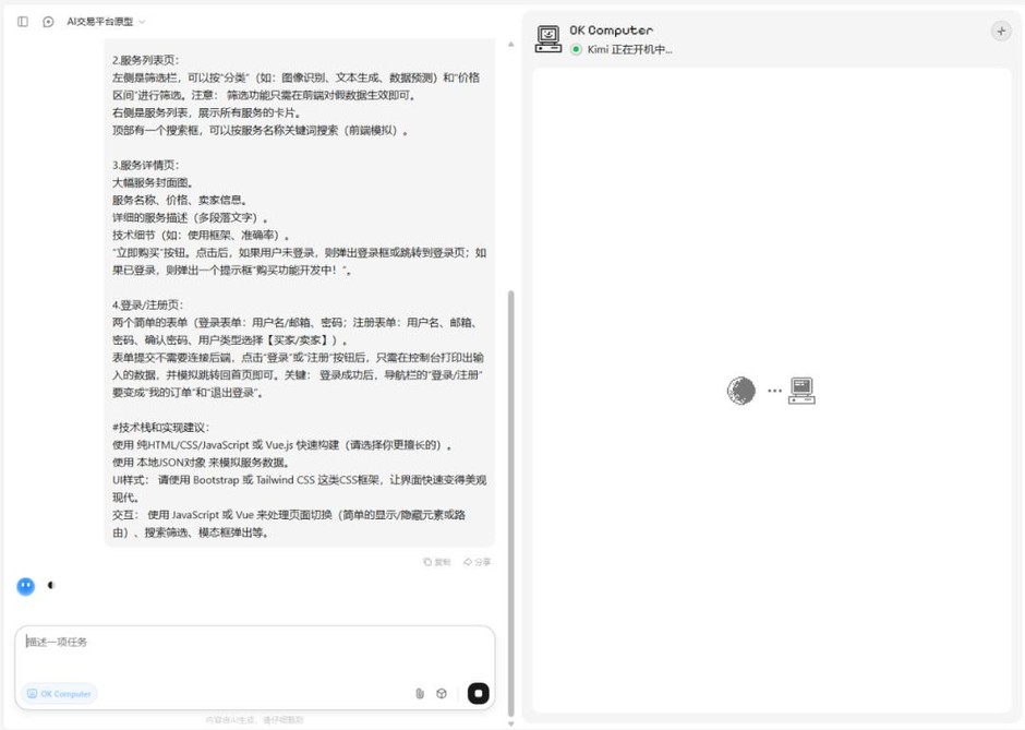 前几天,在云栖大会上看到一个很有意思的产品,叫“AI交易所”(一个撮合AI需求方和开发者的平台)。我试试,看能不能用「OK Computer」把网站原型做出来。