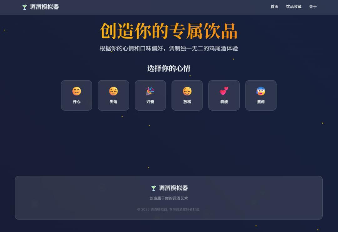 帮我做一个调酒模拟器,用户可以选择调酒材料,自己的心情(如:开心、失落等),以及想要的口味(如:偏甜、果味浓),就能创造一款专属饮品,体验调酒的乐趣。