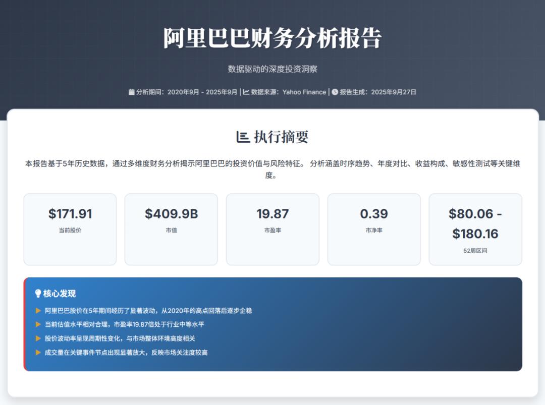 对 阿里巴巴 做一份数据驱动的财务分析,产出非常多样的图表(如时序、对比、构成、分解、敏感性等),每图配清晰解释与结论,整体可以使用稍柔和版的 Neo-Brutalism 风格呈现。使用plotly绘制图表。