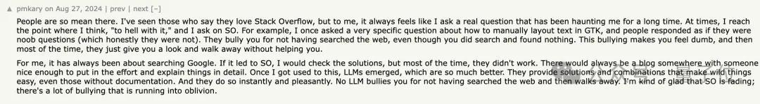 不少程序员直言,社区的氛围有时会令人不舒服,他们现在遇到问题更愿意咨询AI: