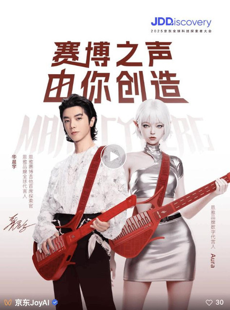 而基于京东乐器品类和恩雅吉他的深入合作,在火星赛博联名款吉他的首发中,当日成交额突破 100 万元,带动品牌整体交易提升了 65%。数字人 Aura 还和恩雅品牌全球代言人华晨宇同框出现,引发热议。