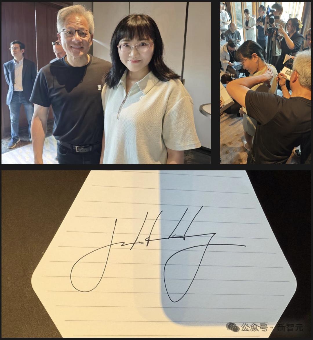 2025年,黄仁勋和新智元创始人杨静女士合影(上方左);在新智元创始人杨静女士背后,黄仁勋在签名(上方右);黄仁勋签名(下方)