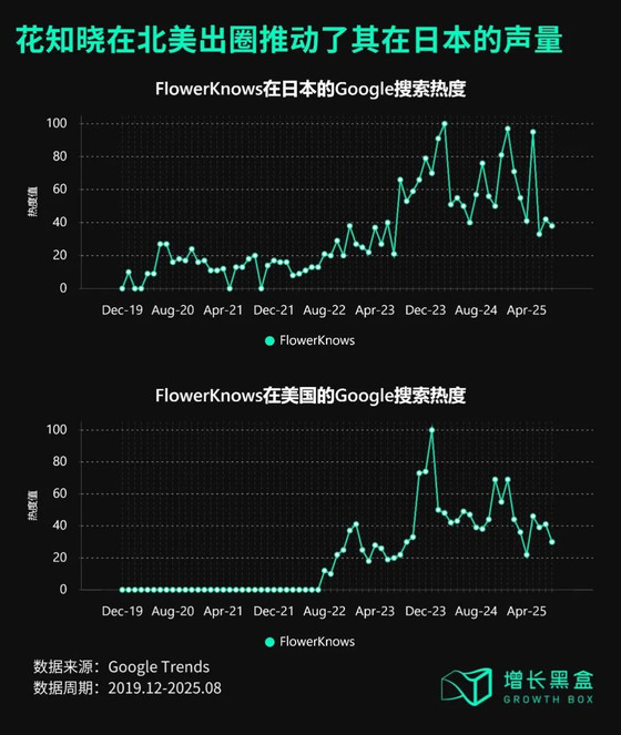 而且有意思的是,回头来看,花知晓在2019-2022阶段布局日本时,并没有充分打开在日本市场的声量和影响力,反而是2023-2025年在北美的出圈,将其在日本市场的声量再拔高了一个量级。