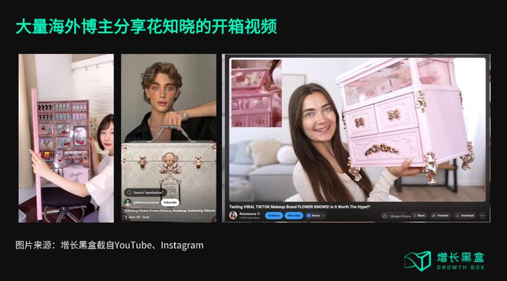 在Youtube、TikTok、Instagram上,有大量博主分享的花知晓开箱视频,尽管博主的国别、语言、肤色各不相同,但视频内容却有异曲同工之处——先被华丽重工、精细雕刻的化妆箱所惊艳,开箱后密集排布的产品带来第二重视觉刺激,而当拆开所有产品包装,将闪耀的产品全部堆放在化妆箱前时,一场花知晓的视觉盛宴也就达到了顶峰。