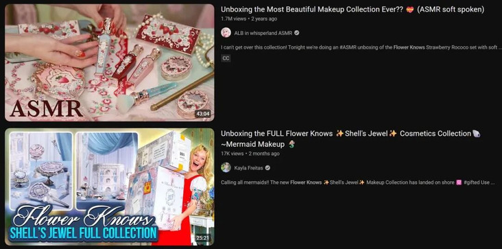 而且因为视听觉效应极佳,花知晓不仅投放了一些美妆博主,还跨界与ASMR(声控)博主多有互动,她们要么轻语介绍花知晓全套产品,要么用花知晓新品进行轻语化妆。