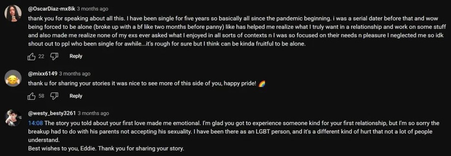 花知晓投放的LGBT博主,会和粉丝分享因为初恋父母无法接受其性取向而分手的故事,粉丝会在评论区安慰博主,粉丝互动感和粘性很强