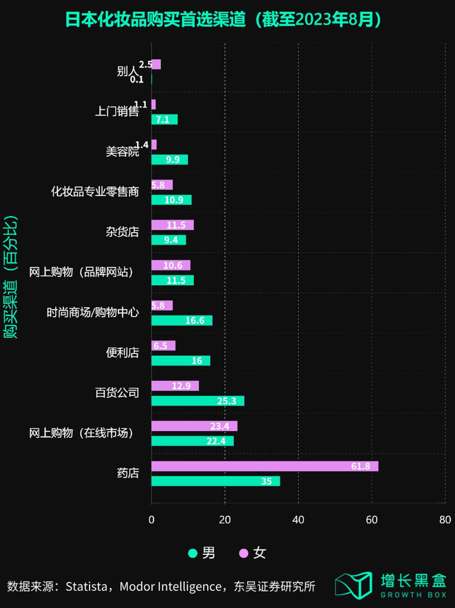 众所周知,日本是一个强线下的市场。根据Statista的数据,截至2023年8月,日本化妆品购买首选渠道是药店,约有61.8%的日本女性选择在药店购买化妆品,而网上购买只占23.4%。