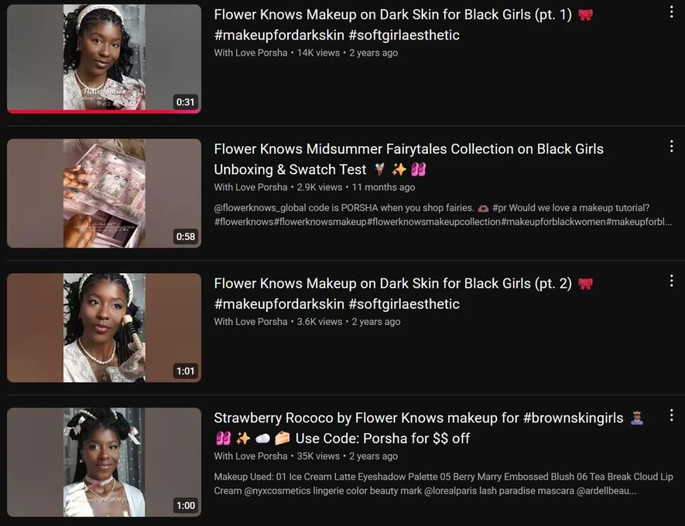 同样的路径在黑人社区也可以看到。我们发现,花知晓找到了With Love Porsha这样的黑人博主,双方合作了多期黑人女孩、棕色皮肤女孩的妆容分享,锚定特定人群的意图强烈。因为社区情感链接强烈,花知晓每次美国上新都能做到30%-50%的复购率[2]。