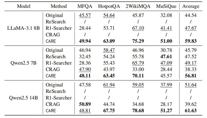 - 性能显著提升:实验数据显示,以 Llama-3.1-8B 模型为例,搭载了 CARE 框架后的模型平均 F1 分数提升了 15.29%。 这一提升在需要综合多个信息点进行推理的复杂多跳任务(如 2WikiMQA 和 MuSiQue)上尤为明显,涨幅分别达到了 29.42% 和 18.92%。