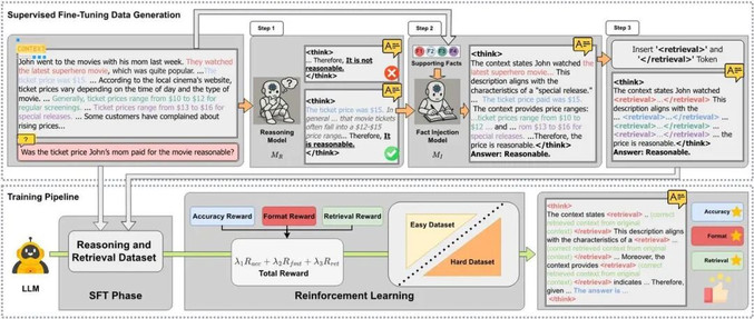 CARE 的突破在于提出了原生检索增强推理这一全新范式。简单来说,就是教会模型在推理过程中利用模型本身的能力自然地引用输入文本中的关键信息。就像学生在答题时会在试卷上划重点一样,模型会在思考过程中插入类似“根据文档第三段提到...”这样的引用,确保每一步推理都有据可依。