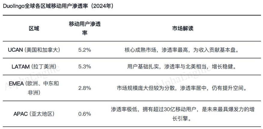 1)亚太市场扩张 :亚太地区( APAC )是 Duolingo 最具潜力的增长引擎。该地区拥有超过 30 亿的庞大移动用户基数,且英语学习需求旺盛,但当前渗透率仅为 0.6% 。