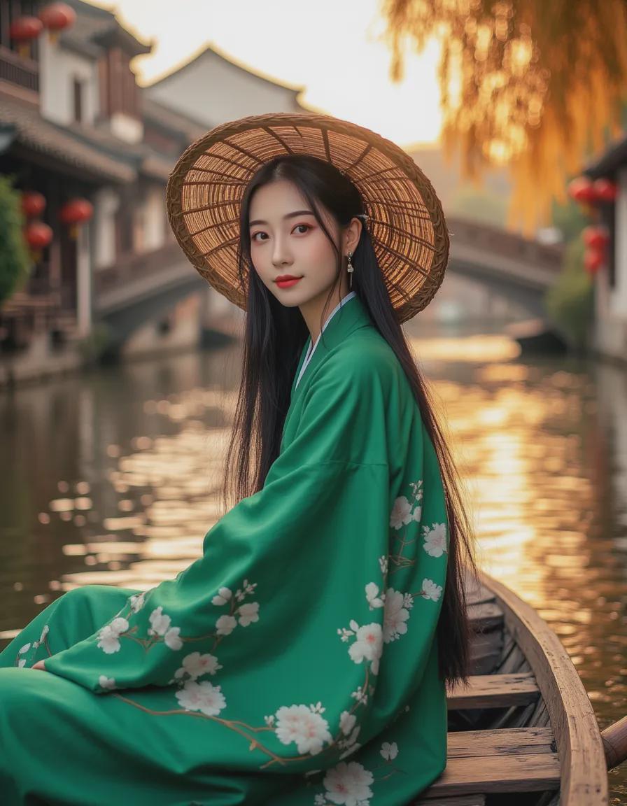 A young girl inancient costume on a boat, A young woman with long, flowing black hair, adorned with jade ornaments, gracefully rows a small wooden sampan through the tranquil canals of a Jiangnan water town. Her vibrant emerald green Hanfu, embroidered with delicate cherry blossom motifs, flows gently in the breeze, mirroring the ripples of the water. A wide-brimmed straw hat, tied with a silken ribbon, shades her serene face from the warm afternoon sun. The golden hour light casts long shadows from the ornate bridges and traditional houses lining the canals, reflecting on the water"s surface in a shimmering dance of light and color. The scene evokes a sense of timeless beauty, tranquility, and the enduring connection between humanity and nature. The image should have a high-definition, photorealistic quality, capturing the intricate details of the scene and the model"s features with stunning clarity. Use a warm color palette with soft lighting to emphasize the peaceful atmosphere. The overall composition should be reminiscent of classical Chinese landscape paintings, emphasizing the harmony and balance within the scene.
