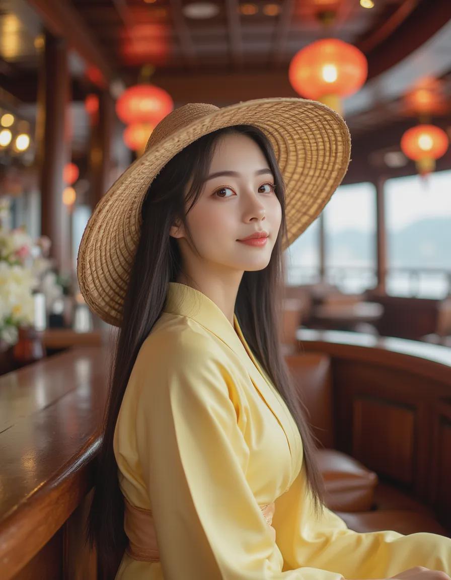 A young girl inancient costume on a boat, A beautiful woman wearing traditional Hanfu and a straw hat is sitting on a Modern cruise ship,In a luxurious bar, the lights suddenly went on. She is wearing light yellow dress, and the photograph is of high-definition quality, featuring a female model