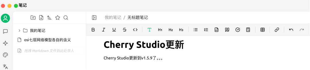 Cherry Studio v1.5.9在修复bug的基础上,又新增了笔记功能,这是很酷的。