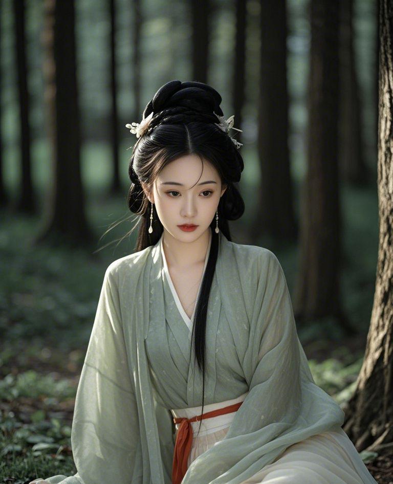 “一位穿着古代华服的美丽女子,在古代中国森林中的中景照片,柔和的自然光,摄影写实风格,神秘而优雅的氛围,平静而迷人的气息。”