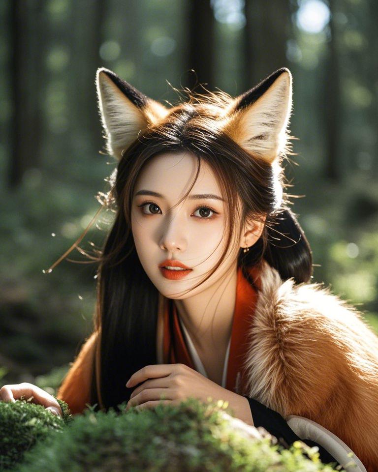 “一位拥有狐狸般特征的美丽女子,在古代中国森林的中景照片,柔和的自然光,摄影写实风格,神秘而优雅的氛围,平静而迷人的气息。”