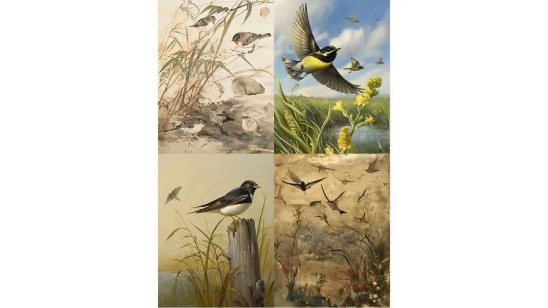 咒语:Whose new swallow pecks at the spring mud The grass grows long, and the warbler flies." This phrase depicts the arrival of spring with the flourishing of vegetation and the return of migratory birds--ar 3:4 --style raw --s 50 --niji 6