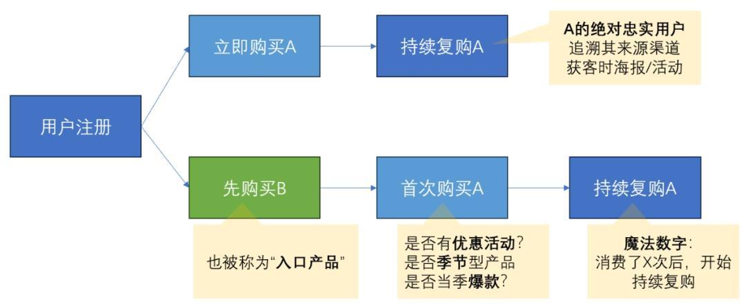 根据用户多次点击/转发/购买行为,找到用户的兴趣所在,是第二步动作。假设用户对A商品复购次数多,且购买金额高于平均用户50%+,可以将该用户定义为“A商品爱好者”,作为标签记录在CDP,这些数据对后续分析非常有用。用户成长路径做完上一步分析,能找到特定商品/内容偏好用户,我们会自然思考: