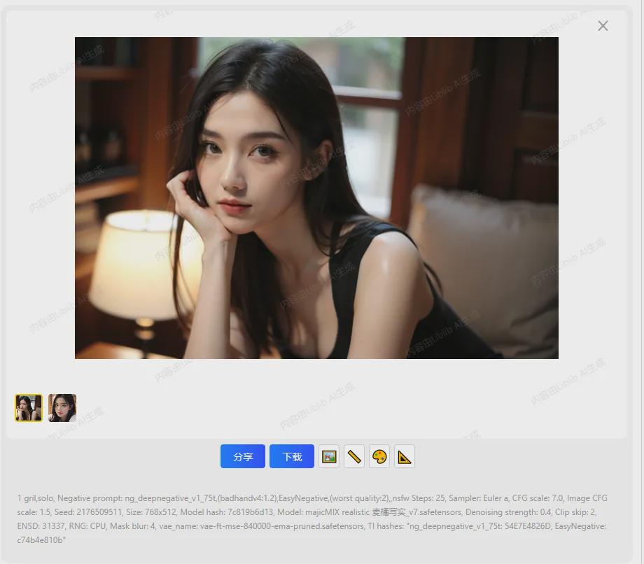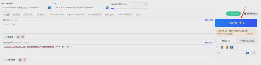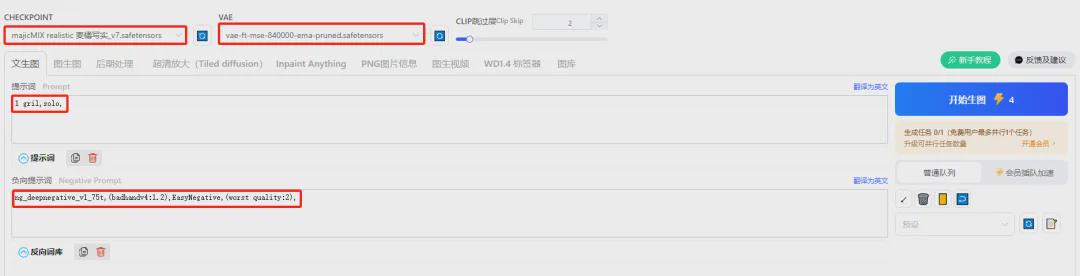 - CLIP跳过层Clip Skip:2(默认值,一般保持不变)