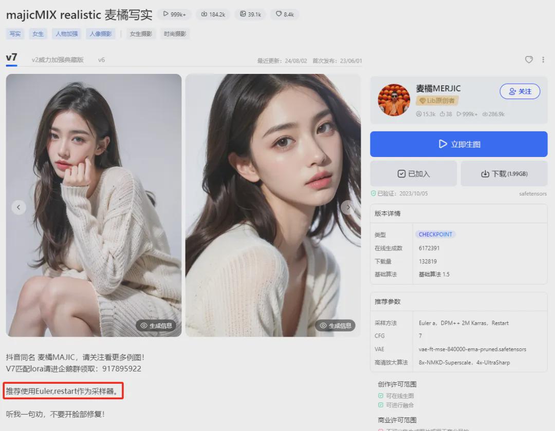 - CHECKPOINT(大模型):majicMIX realistic 麦橘写实_v7.safetensors