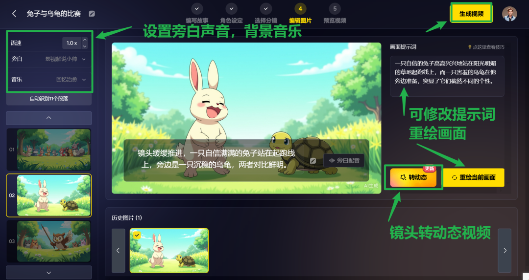 转动态,可将镜头图片转成动态视频,左侧可设置旁白声音等,直接看下图所示。