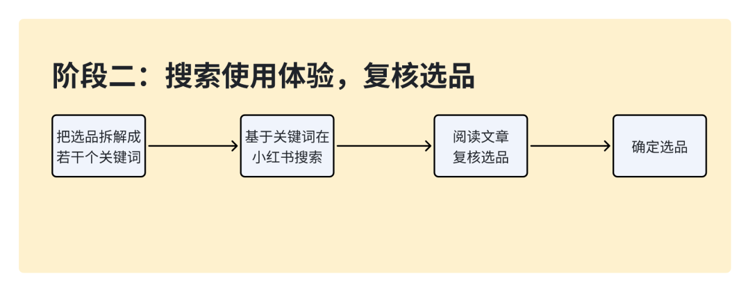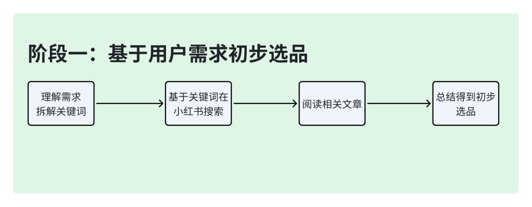 阶段一:初步选品;在用户描述需求后,先基于用户的需求进行关键词拆解,然后在小红书上进行搜索,基于搜索信息得到初步选品。