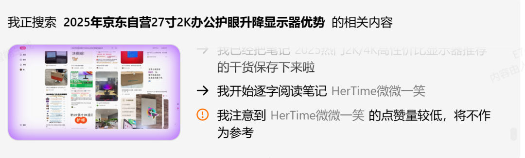 比较有意思的是它在交付的时候最上边给到了种草攻略来源,我们可以很直观的看到它筛选产品的逻辑,然后自己点进去看看这个帖子怎么样,到底靠不靠谱。