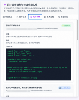 基于专业前端开发经验,需求分析Agent对输入材料进行深度解析,自动识别并拆解核心功能模块边界,精准定位当前需求对现有系统的影响范围。同时生成清晰、结构化的技术实现规划,并识别模块间依赖关系和开发优先级,为后续开发环节提供明确指导。